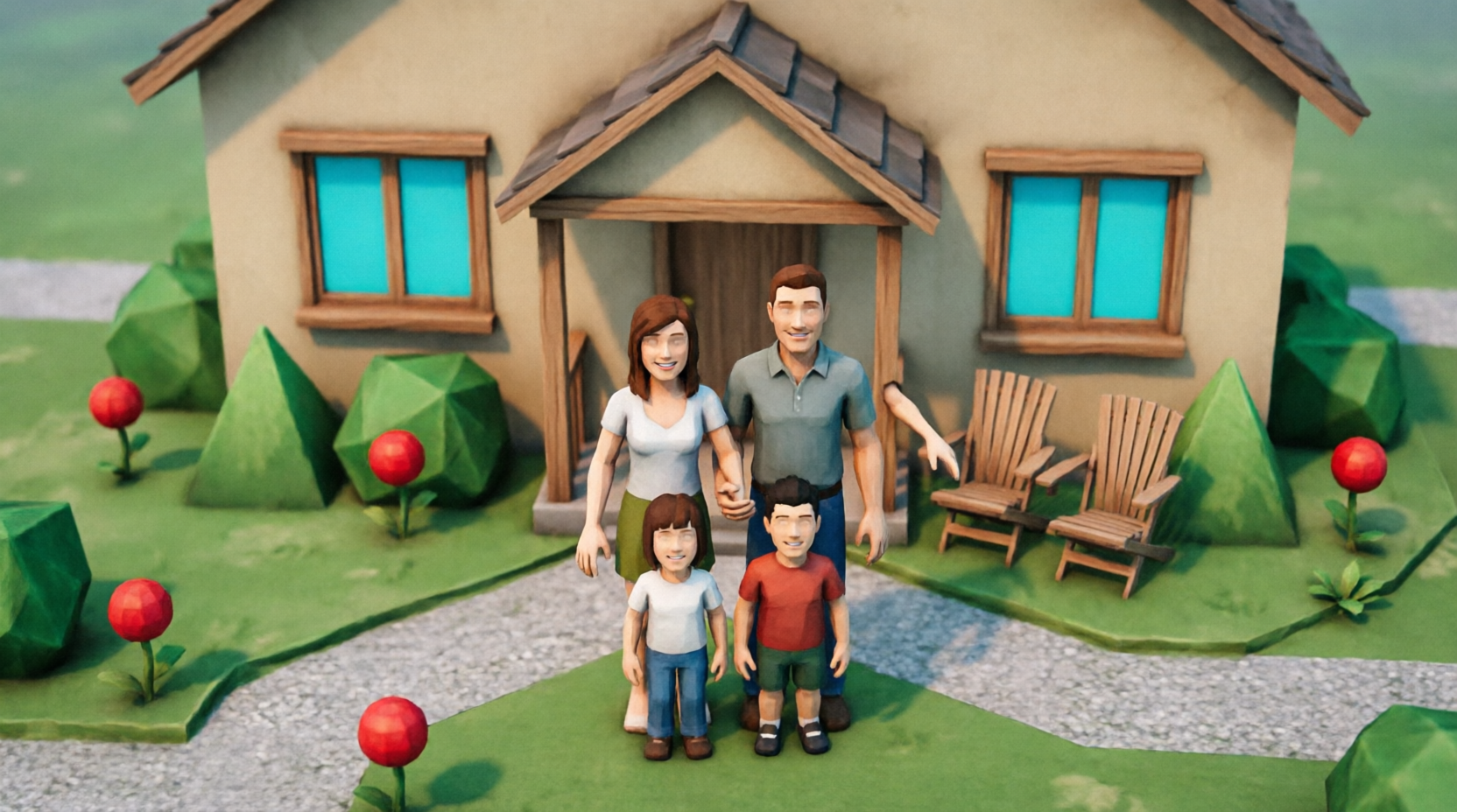 Я сгенерила персонажей в стиле Симс. Запрос: "счастливая семья, улыбается, дом с садом, 2000-е годы".👍